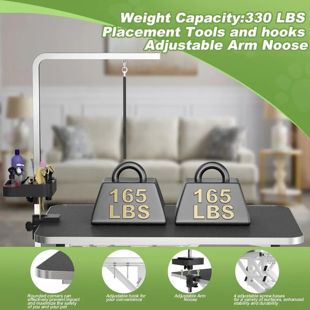 - MULTIFUNCTIONAL DOG GROOMING ARM: The pet table comes with an adjustable grooming arm with a tool organizer that can hold up to 5kg of tools and supplies. In addition, the bottom of the table is equipped with three adjustable hooks, allowing you to hang additional items conveniently for your pet's grooming.